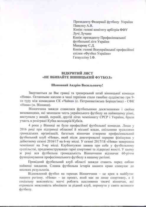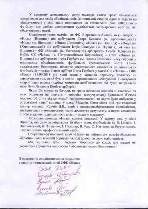 На сайті ФК «Нива» (Вінниця) розміщено офіційне звернення колективу клубу до керівництва вітчизняного футболу з проханням «не вбивати» вінницький футбол». Підписали його гравці і тренери команди. У зверненні наводяться факти систематичного упередженого суддівства, яке вплинуло на хід і результат матчів.