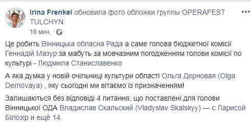 «Замість створення нових культурно-туристичних маркерів Вінницької області, бюджетна комісія Вінницької обласної ради вирішила знищити найбільший оперний фестиваль України під відкритим небом. Коли ми готували підсумкове відео міжнародного фестивалю @Operafest Tulchyn за 2017-2019 роки, я не могла передбачити, що буду його оприлюднювати за таких обставин і звертатися до голови бюджетної комісії пана Геннадія Мазура, який нагороджений почесною відзнакою області Покровитель культури – Вінницької області – 2019. Він своїм рішенням перенаправив 2 мільйони гривень з галузі культури (з гуманітарної сфери) в аграрний сектор. Я не говорю про те, що це рішення – сигнал для міжнародних інституцій та партнерів, які підтримують фестиваль OPERAFEST TULCHYN, що Вінницької області цей проект не потрібен. Це напряму впливає на сталість проекту Пан Мазур ігнорує такі якісні та кількісні показники, як: 135 тисяч глядачів, з яких більш ніж 20 тисяч- дитяча аудиторія. 15 млн грн Інвестиції в культурний продукт території в сукупності за 2017-2019 роки по всіх грантах та програмах за участі адміністрації в обсязі 4 млн грн що складає менш ніж 30%. Тульчин – це: Леонтович Арт квартал, ревітализована Музей-квартира М. Д. Леонтовича, 6 ексклюзивних оперних постановок за три роки, перший в Європі дитячий оперний фестиваль KIDS OPERAFEST, відродження Палацу Потоцьких, який руйнувався до 2017 року через бездіяльності депутатського корпусу облради, а його західна будівля продовжує руйнуватись, і саме проведення фестивалю привернуло увагу інвесторів та донорів щодо відновлення Палацу, наявність сталих партнерств із провідними театрами України, Європи та потужними агенціями США», - зазначає пані Ірина.