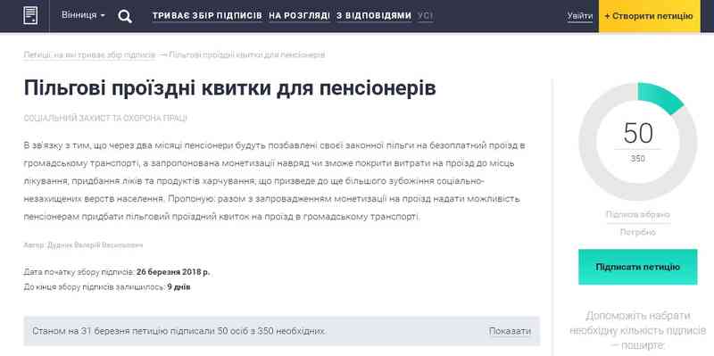 Петиція щодо пільги мляво набирає електронні підписи – з 26 березня її підписали лише 50 громадян. Зазначимо, щоб звернення розглядали необхідно 350 підписів.