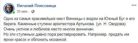 Про те, що кам’яні сходи від вулиці Оводова до Південного Бугу потребують негайного ремонту вінничани кажуть багато років. Окраса Вінниці, місцеві «потьомкінські сходи», надбання славетного Григорія Артинова. Вінницький архітектор Віталій Плясовиця запропонував «революційне» рішення щодо оновлення цього об’єкту.