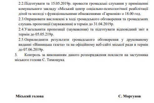 Відповідно до розпорядження міського голови Вінниці, опублікованого на сайті міської ради, громадські слухання мають відбутися 15 травня цього року о 18.00 в приміщенні комунального закладу «Міський центр соціально-психологічної реабілітації дітей та молоді з функціональними обмеженнями «Гармонія». А до 7 червня поточного року повинні бути відомі результати громадського обговорення.
