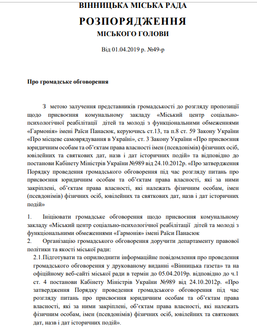 Вінницька міська рада ініціює громадське обговорення щодо присвоєння комунальному закладу «Міський центр соціально-психологічної реабілітації дітей та молоді з функціональними обмеженнями «Гармонія» імені Раїси Панасюк, яка у свій час і була ініціаторкою його заснування у Вінниці.
