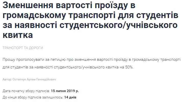 Вінничанин Артем Остапчук пропонує розширити перелік пільгових категорій у муніципальному транспорті. Він 15 липня опублікував петицію до міськради, в якій наголошує на тому, аби в КП «Вінницька транспортна компанія» брали за проїзд вдвічі менше при наявності у пасажира студентського чи учнівського квитка.
