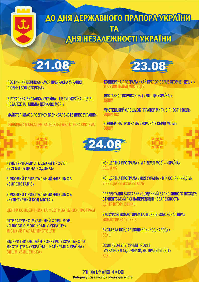 Також до Дня Незалежності та Дня Прапора України заклади культури проведуть ряд онлайн-заходів з 8:00 до 21:00. Їх можна буде подивитись на вебресурсах цих закладів та на сторінці VinCulture Code у Facebook у зазначені дні. Серед них – виставки, поетичний вернісаж, флешмоби, онлайн-конкурс тощо. Детально з програмою заходів можна ознайомитись на афіші.