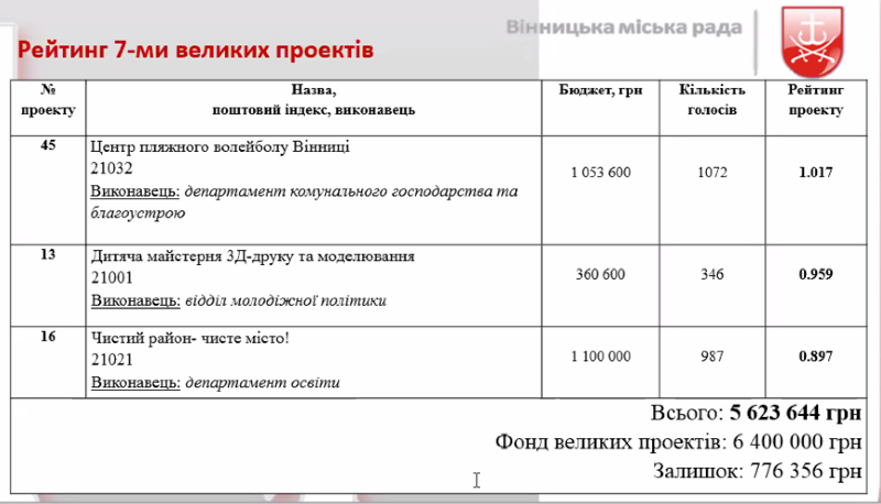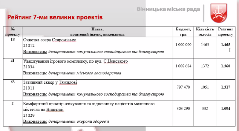 За проєкти вінничани віддали загалом 19 094 голосів: за великі проекти – 12 556 голосів, за малі – 6 538 голосів. Серед великих проєктів Координаційної ради конкурсу «Бюджет громадських ініціатив Вінницької міської ОТГ» визначила таких переможців: