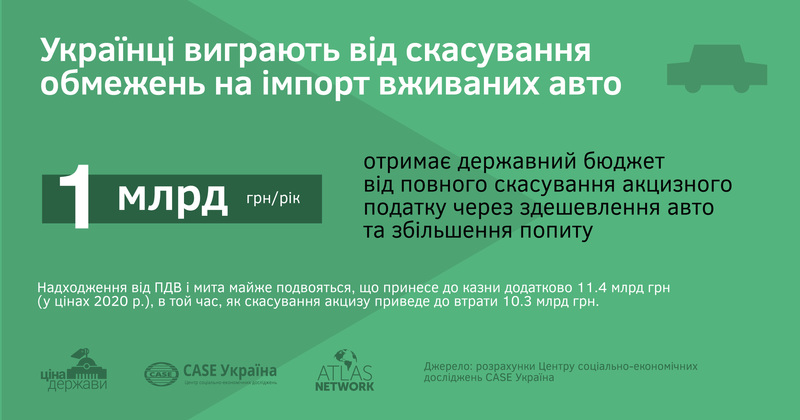 За словами співавтора дослідження старшого економіста CASE Україна Володимира Дубровського, згідно із розрахунками, ліквідація “вікового” акцизу збільшить імпорт машин удвічі – до 700 тис. на рік. “Надходження від ПДВ і мита майже подвояться. Це принесе бюджету додатково 11,4 млрд грн, в той час як скасування акцизу призведе до втрати 10,3 млрд грн”, – додає пан Дубровський. Таким чином від зменшення вартості розмитнення вживаних авто бюджет не лише не втратить, а й отримає додатково понад 1 млрд грн. Ці розрахунки нівелюють аргумент Міністерства фінансів України щодо відсутності компенсаторів для наповнення бюджету.