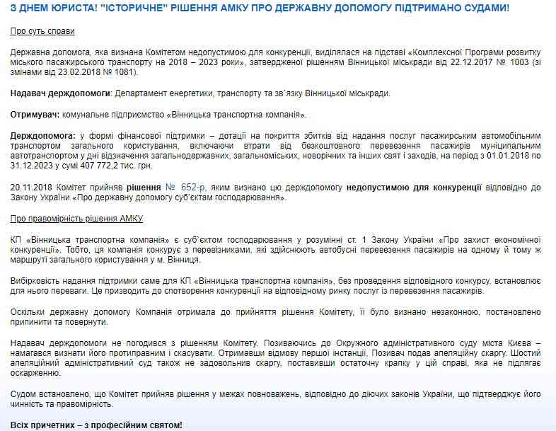 В АМКУ заявляють про те, що Шостий адміністративний апеляційний суд підтвердив рішення Окружного суду Києва щодо правомірності рішення комітету відносно допомоги Вінницької міськради КП «Вінницька транспортна компанія».