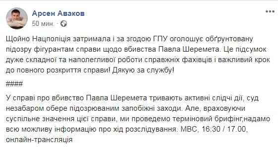 «Щойно Нацполіція затримала і за згодою ГПУ оголошує обґрунтовану підозру фігурантам справи щодо вбивства Павла Шеремета. Це підсумок дуже складної та наполегливої роботи справжніх фахівців і важливий крок до повного розкриття справи», – йдеться в його дописі.