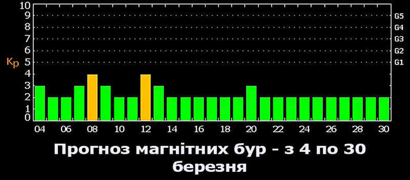 Утім, надзвичайно сильних магнітних бур у березні ніби не буде. Натомість певні збурення магнітосфери нашої планети очікується напередодні та у Міжнародний жіночий день. А крім того – 12, 13 та 20 березня.