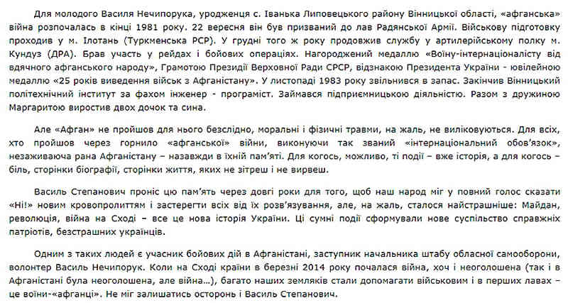 Ось що, зокрема, розповідається про нього на сайті Вінницької обласної спілки ветеранів війни в Афганістані.